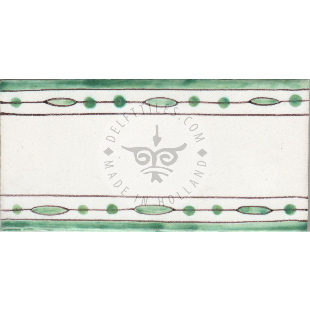 Border Tile 10 – line and dots green 13 x 6.5 cm (5-1/8 x 2–7/16 in) Corner pieces: 6.5 x 6.5 cm (2–7/16 in) Can be painted on a full field tile as well (5-1/8 in sq.) Bullnose edge available on request. Select ‘multi color’ for this color. Product Number: B10_g Tile color Off white Ivory Antique look i - tiles have more irregularities - invisible or visible made crackled glaze Decoration color Blue Sepia Multi color Border Tile 10 - line and dots green quantity Add to cart Add to Quote Product already in the list. View quotation list SKU: B10_g Categories: Border, Border tiles, Delft Blue tiles & panels