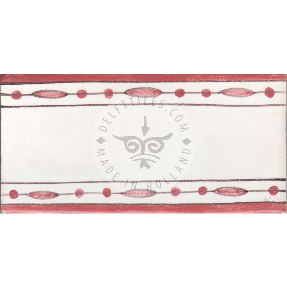 Border Tile 10 – line and dots red 13 x 6.5 cm (5-1/8 x 2–7/16 in) Corner pieces: 6.5 x 6.5 cm (2–7/16 in) Can be painted on a full field tile as well (5-1/8 in sq.) Bullnose edge available on request. Product Number: B10_r Tile color Off white Ivory Antique look i - tiles have more irregularities - invisible or visible made crackled glaze Decoration color Blue Sepia Multi color Border Tile 10 - line and dots red quantity Add to cart Add to Quote Product already in the list. View quotation list SKU: B10_r Categories: Border, Border tiles, Delft Blue tiles & panels
