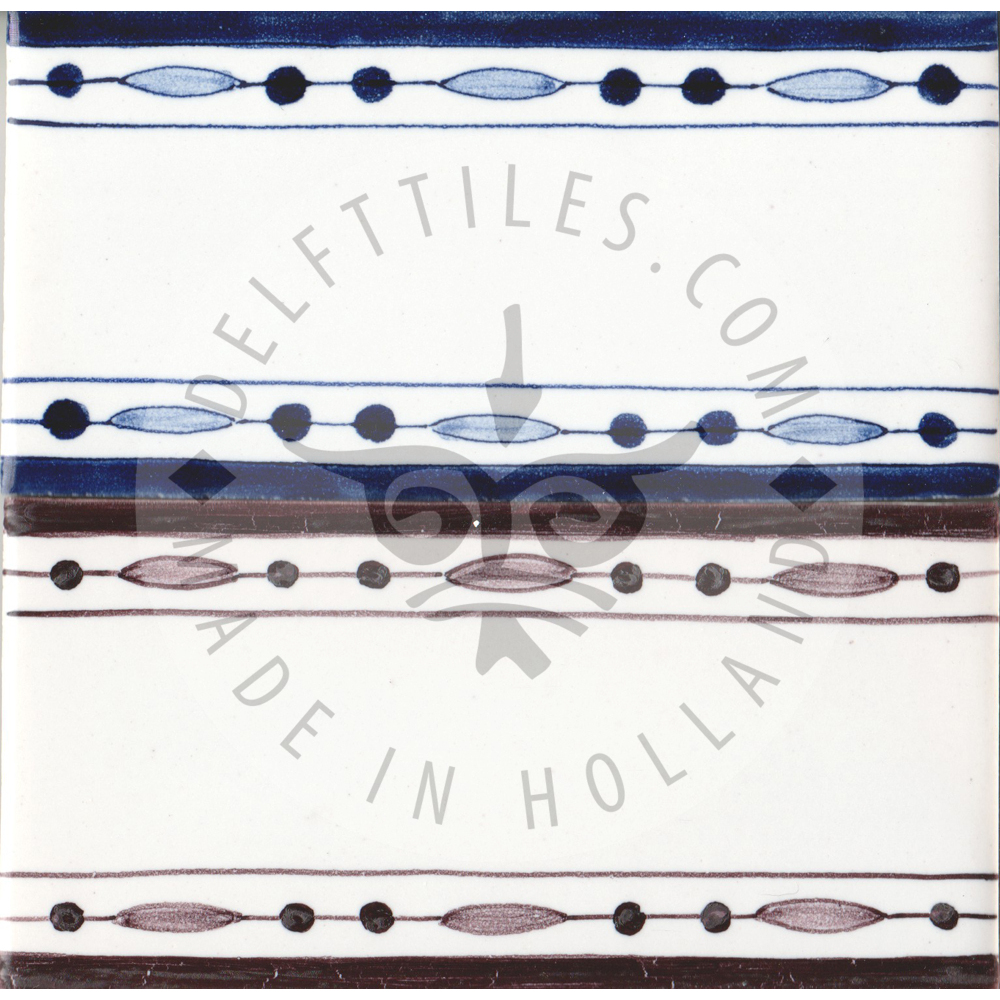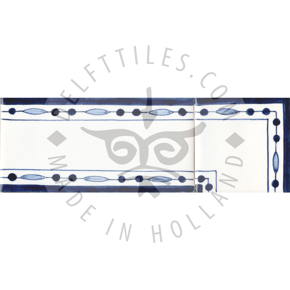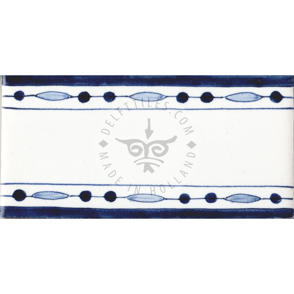 Border Tile 10 – line and dots 13 x 6.5 cm (5-1/8 x 2–7/16 in) Corner pieces: 6.5 x 6.5 cm (2–7/16 in) Can be painted on a full field tile as well (5-1/8 in sq.) Bullnose edge available on request. Product Number: B10 Tile color Off white Ivory Antique look i - tiles have more irregularities - invisible or visible made crackled glaze Decoration color Blue Sepia Multi color Border Tile 10 - line and dots quantity Add to cart Add to Quote Product already in the list. View quotation list SKU: B10 Categories: Border, Border tiles, Delft Blue tiles & panels