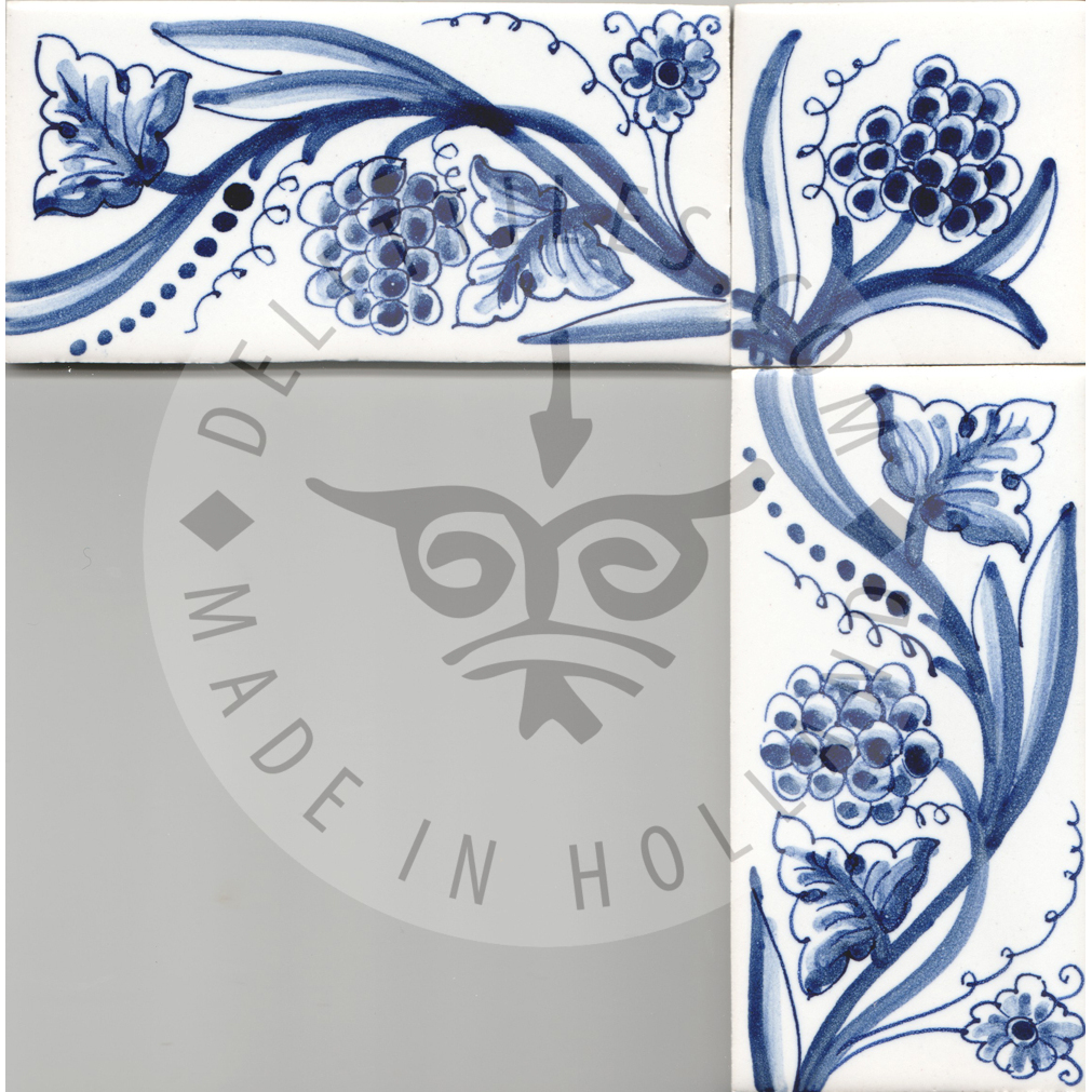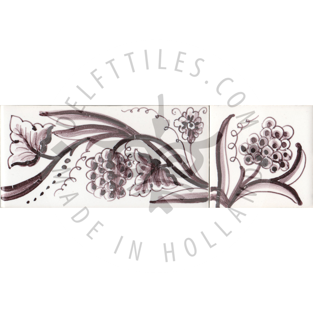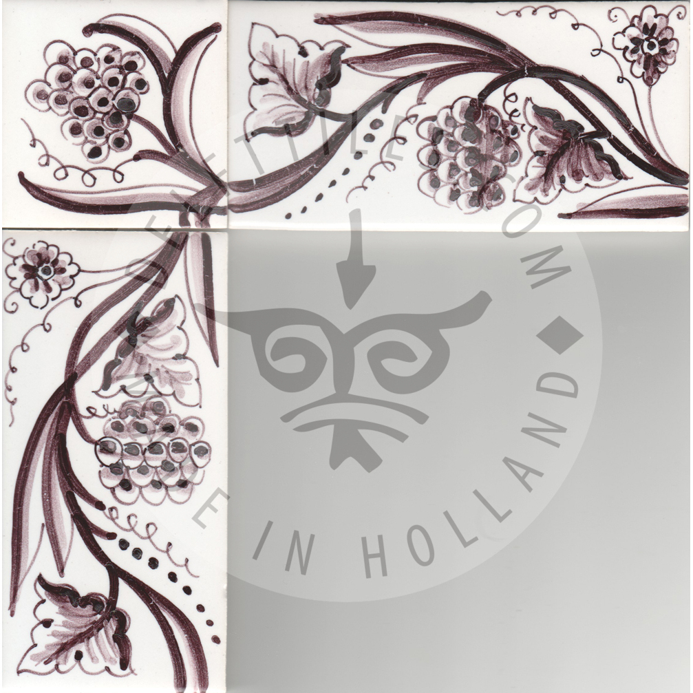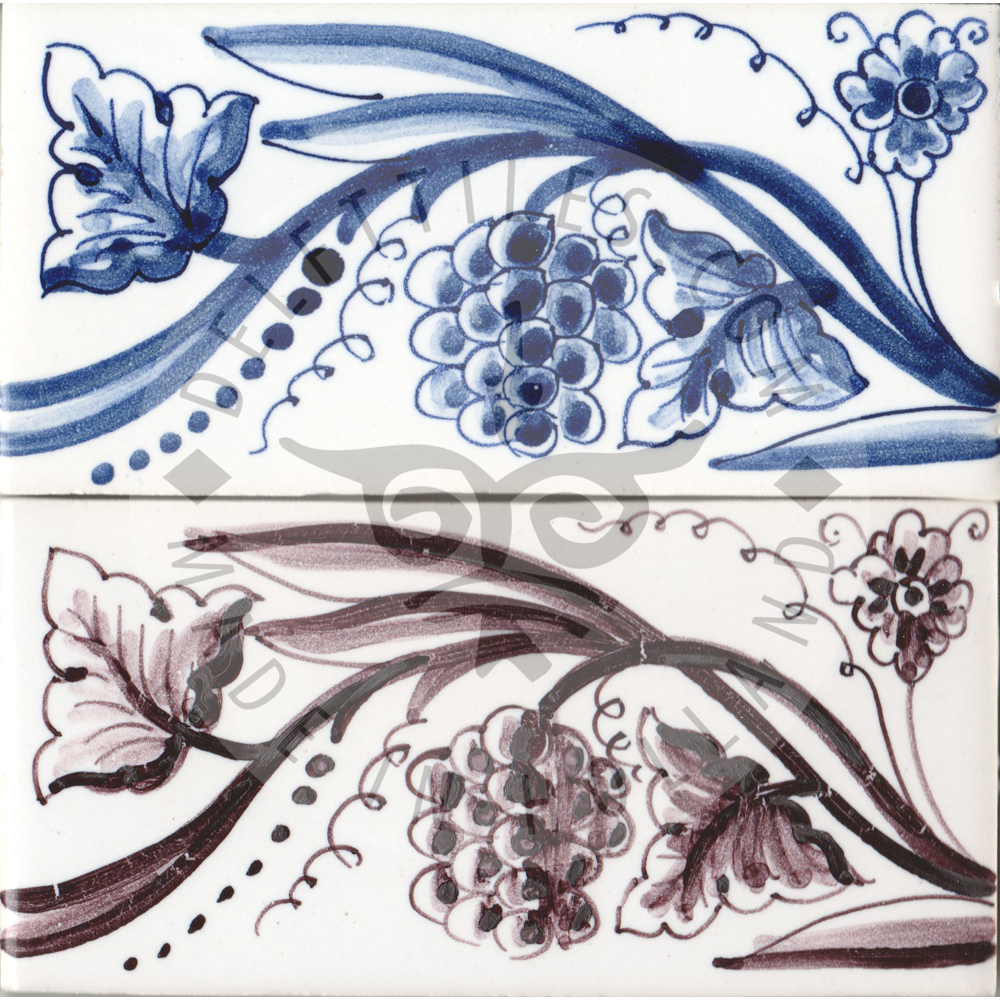 Border Tile 05 – Grapes on Vine 13 x 6.5 cm (5-1/8 x 2–7/16 in) Corner pieces: 6.5 x 6.5 cm (2–7/16 in) Can be painted on a full field tile as well (5-1/8 in sq.) Bullnose edge available on request. Product Number: B05 Tile color Off white Ivory Antique look i - tiles have more irregularities - invisible or visible made crackled glaze Decoration color Blue Sepia Multi color Border Tile 05 - Grapes on Vine quantity Add to cart Add to Quote Product already in the list. View quotation list SKU: B05 Categories: Border, Border tiles, Delft Blue tiles & panels