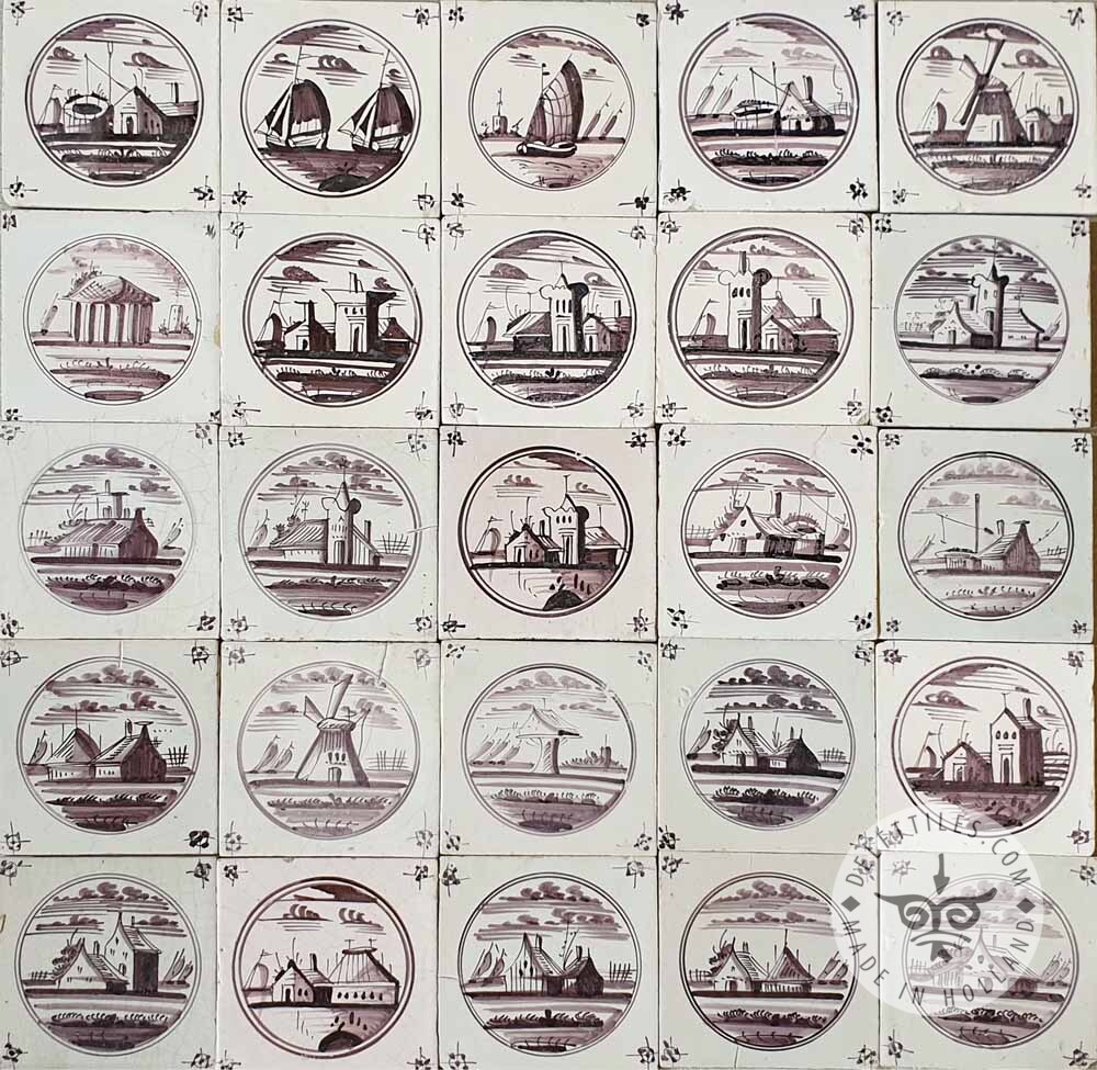 Antike Fliesen aus dem 18. Jahrhundert mit Sepia-Mangan-Landschaft im Kreis